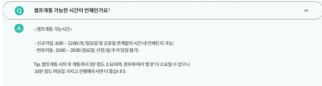 참고로 개통 시간은 신규가입일 경우에는 토요일, 일요일 뿐 아니라 공휴일도 개통이 가능하고요. 아침 8시부터 저녁 10시까지 가능합니다. 번호이동으로 가입하는 경우에는 일요일과 신정/설/추석 당일에는 개통이 불가하고 아침 10시부터 저녁 10시까지 개통가능합니다.