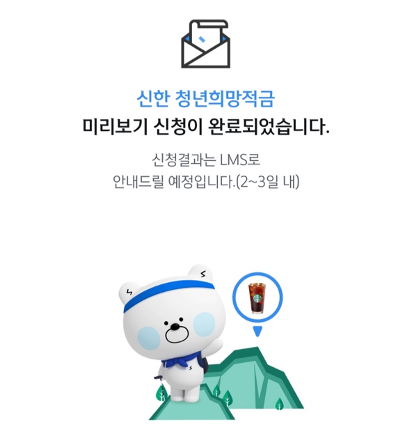 지금 신한은행에서 미리보기 서비스를 해보고 3월 1일까지 청년희망적금 가입까지 완료를 하면, 스타벅스 아메리카노 톨 사이즈를 선착순 1만명에게 증정한다고 하니까, 신한에서 하실 분들은 빠르게 서비스를 신청하시고 가입까지 완료하시기를 바랍니다. 참고로 21일부터 신청이 가능하답니다.