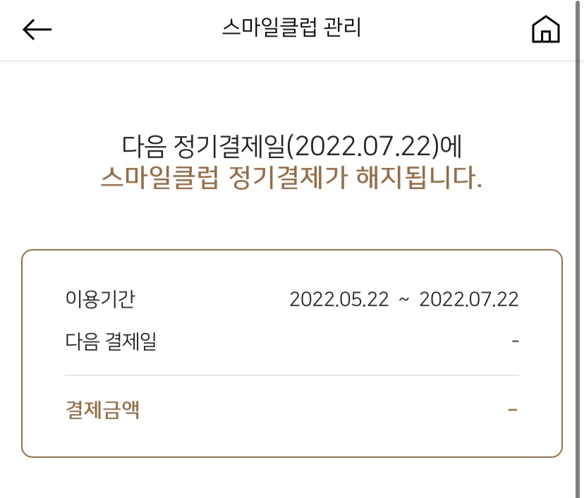 상단의 톱니바퀴를 눌러서 스마일클럽 관리로 들어가면 밑으로 내려 해지가 가능한데, 해지버튼이 회색으로 되어있고 유지하기 버튼이 빨간색으로 활성화가 되어있는 것 처럼 보여서 헷갈립니다.