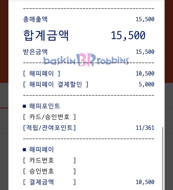 카드 번호와 비번만 입력해주면 바로 결제가 되고, 등록한 카드를 무인 계산대에 바코드 찍기만 하면 바로 결제되어서 5천원 할인된 금액인 10,500원에 먹을 수 있답니다. 간단하면서도 놓치면 아까우니까 베스킨 좋아하는 분들은 꼭 해피페이로 결제하시고 할인받으세요!!