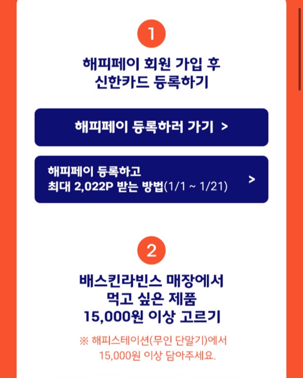 지금 이벤트도 하고 있어서 최초 등록 후 미션을 성공하면 2,022포인트까지 받을 수 있어요. 미션은 등록하고 결제로 물건 사는 것과 해피스테이션 사용하기 등등인데 저는 굳이 그런것 까지는 참여하지 않았고 베스킨만 할인받으려고 등록만했습니다.